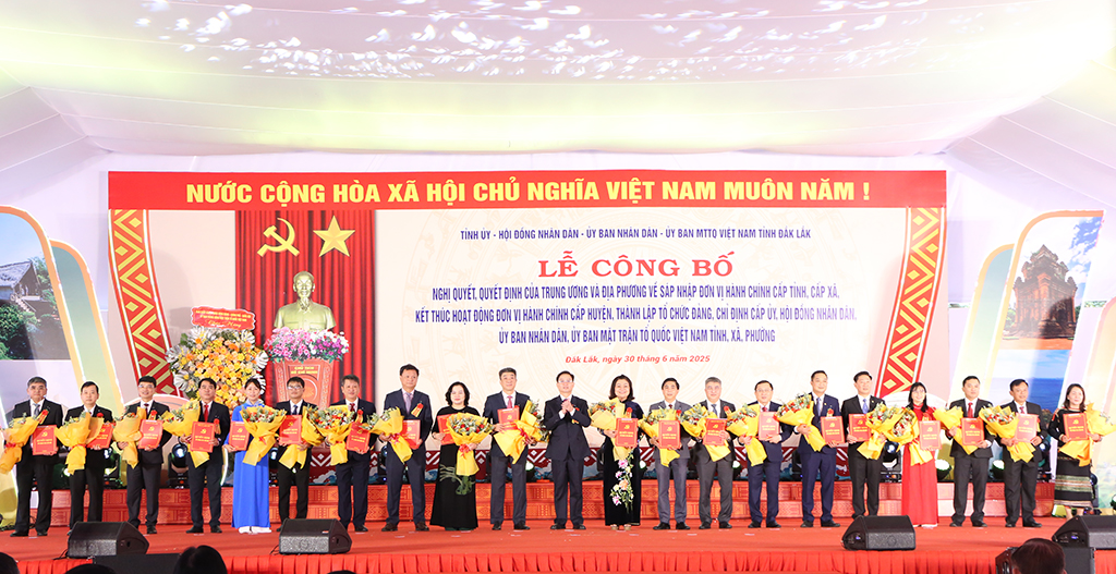 Sáng 30/6, tại Quảng trường 10/3, Tỉnh ủy, HĐND, UBND, Ủy ban MTTQ Việt Nam hai tỉnh Đắk Lắk và Phú Yên long trọng tổ chức Lễ công bố các nghị quyết, quyết định của Trung ương và địa phương về sáp nhập đơn vị hành chính cấp tỉnh, cấp xã, kết thúc hoạt động đơn vị hành chính cấp huyện, thành lập tổ chức đảng, chỉ định cấp uỷ, HĐND, UBND, Ủy ban MTTQ Việt Nam tỉnh, xã, phường.