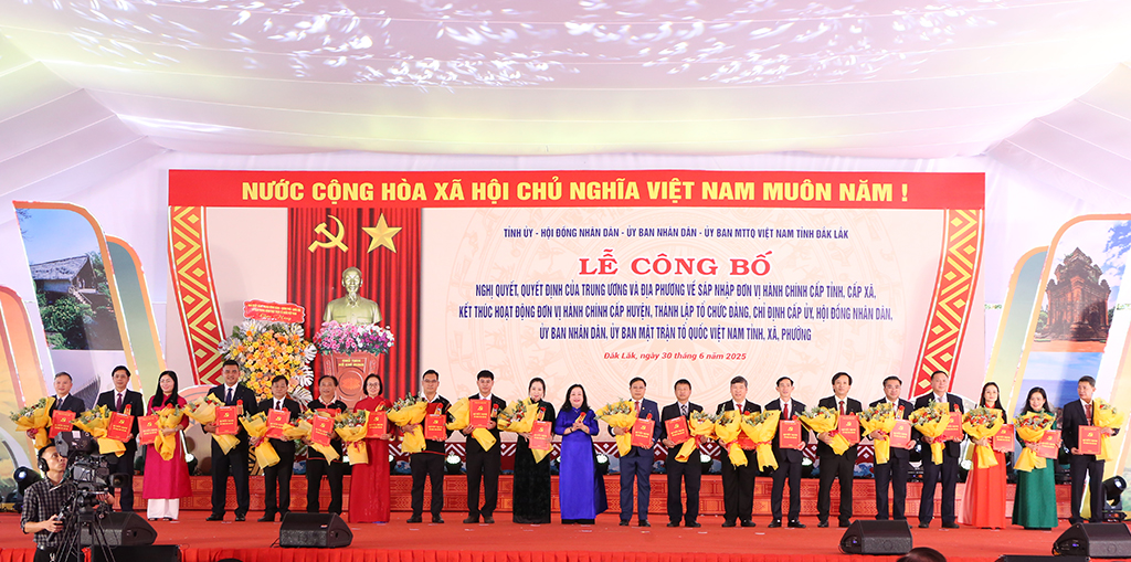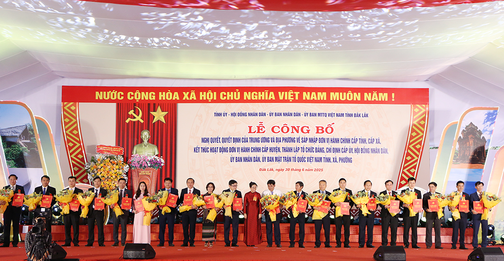 Tại buổi lễ, đồng chí Huỳnh Thị Chiến Hòa - Phó Bí thư Tỉnh ủy đã công bố các Quyết định của hai tỉnh Đắk Lắk và Phú Yên, gồm: Quyết định của Ban Chấp hành Đảng bộ huyện về việc kết thúc hoạt động cấp xã (cũ); Quyết định của Ban Chấp hành Đảng bộ tỉnh về việc kết thúc hoạt động các đảng bộ cấp huyện (cũ); Quyết định của Ban Chấp hành Đảng bộ 2 tỉnh về thành lập 102 Đảng bộ các xã, phường (mới); Quyết định chỉ định nhân sự Ban Chấp hành, Ban Thường vụ, Bí thư, Phó Bí thư của 102 xã, phường; Quyết định chỉ định Ủy ban Kiểm tra, Chủ nhiệm, Phó Chủ nhiệm Ủy ban Kiểm tra của 102 xã, phường; Nghị quyết chỉ định Chủ tịch, Phó Chủ tịch, Trưởng ban của HĐND của 102 xã, phường; Nghị quyết chỉ định Chủ tịch, Phó Chủ tịch UBND của 102 xã, phường; Quyết định của Ủy ban MTTQ Việt Nam tỉnh thành lập MTTQ Việt Nam của 102 xã, phường.